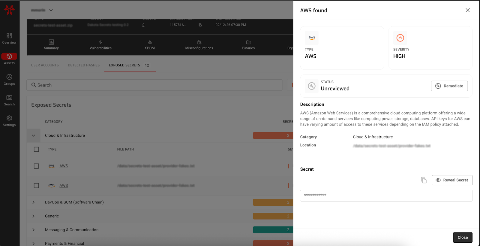 Each secret includes a status (such as Unreviewed) and a Remediate action, and the Exposed Secrets table shows remediation counts per category. As teams work through findings, you can see what is still outstanding and what has been addressed. Combined with the preserved description, location, and severity, this creates a clear record you can point to when closing tickets, validating that cleanup landed in new builds, or explaining to stakeholders how a credential issue was handled.